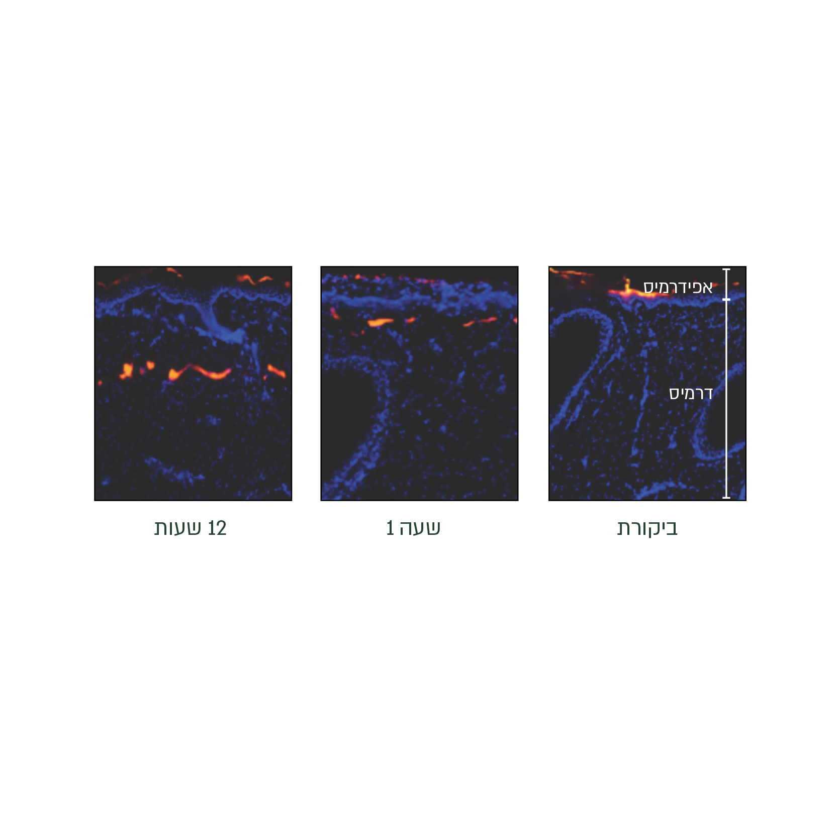 ניתן לראות את התפשטות החומר (המסומן באדום) משכבת האפידרמיס אל הדרמיס כבר לאחר שעה אחת מהמריחה ובעומק רב יותר לאחר 12 שעות.